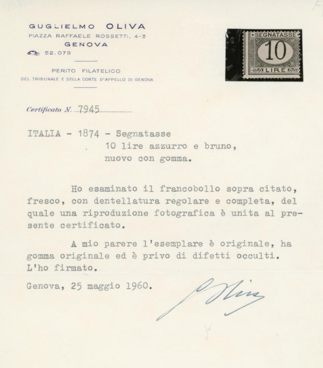 1874 - 10 lire azzurro e bruno (14), nuovo, gomma originale integra, perfetto. A.Diena, cert. G.Oliva.