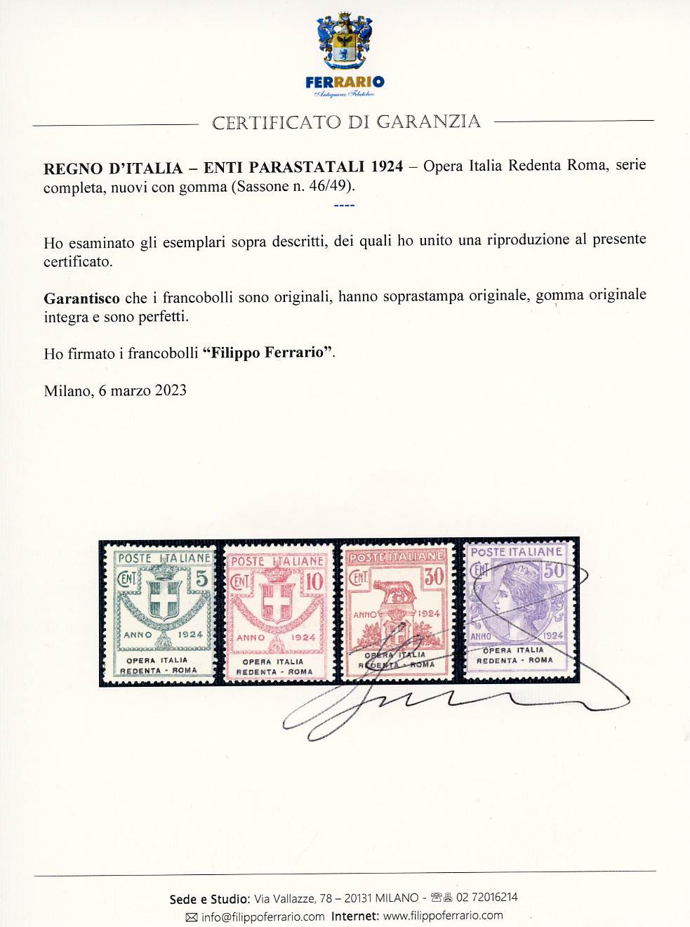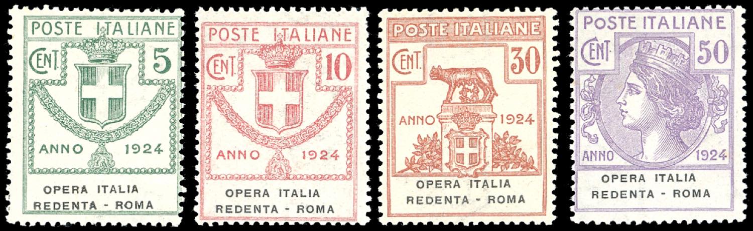 OPERA ITALIA REDENTA-ROMA 1924 - Serie completa (46/49), gomma originale integra, perfetti. Cert. Ferrario.