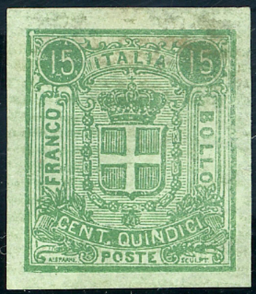 1863 - 15 cent. verde su carta vergata, non emesso, tipografia Sparre. Molto bello e molto raro! Ferrario.