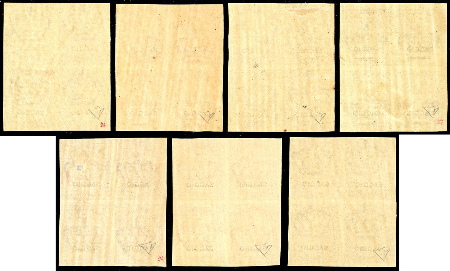1863 - De la Rue, blocchi di quattro gommati dei valori da 1 cent., 5 cent., 10 cent., 15 cent., 30 cent., 40 cent., e 60 cent., soprastampati "SAGGIO", perfetti, gomma originale integra. Due esemplari con lieve traccia di linguella. Molto belli, insieme non comune. E.Diena.