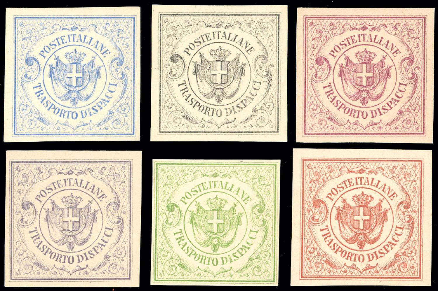 1864 - Trasporto dispacci, saggi Hummel, sei esemplari in colori differenti, senza gomma come sempre, perfetti e di ottima qualità. Cert. Raybaudi.
