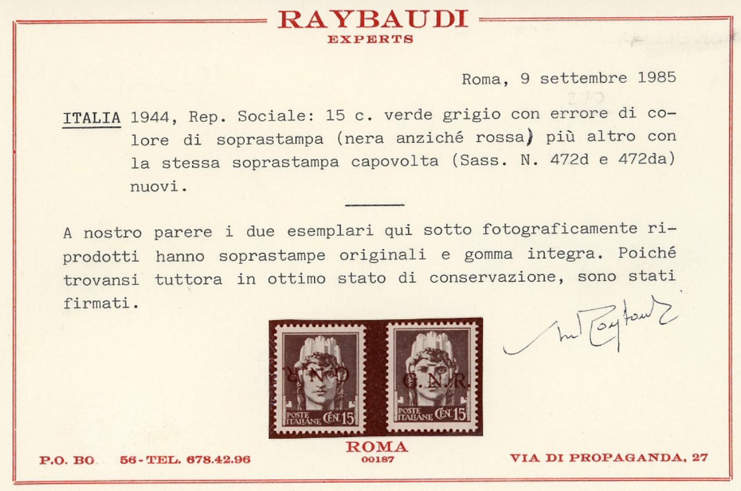 1944 - 15 cent. soprastampa G.N.R. di Verona in nero, errore di colore, un esemplare normale e uno con soprastampa capovolta (472A,472Aa), gomma originale integra, perfetti. Cert. Raybaudi.