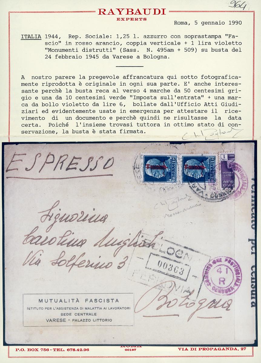 1945 - 1,25 lire soprastampa fascio in rosso arancio, 1 lira Monumenti distrutti (495E,509), perfetti, su busta per espresso da Varese 24/2/1945 a Bologna, verificata per censura. Al verso vennero applicate 4 marche da 50 cent. e una da 10 cent. Imposta sull'entrata e una marca da bollo da 6 lire, annullate dall'Ufficio Atti Giudiziari. Non comune. Dettagliato cert. Raybaudi.