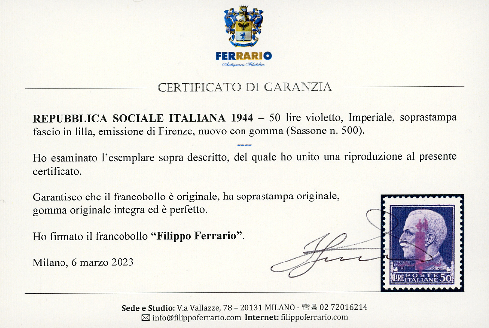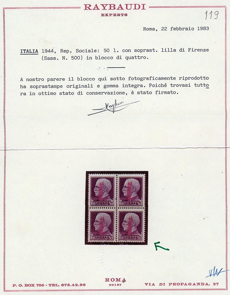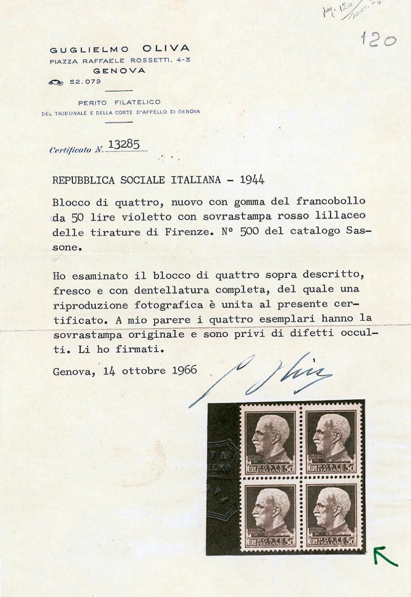 1944 - 50 lire, soprastampato fascio in lilla, emissione di Firenze (500), gomma originale integra, perfetto. Fotocopie cert. G.Oliva e Rayabudi del blocco di provenienza, cert. Ferrario.