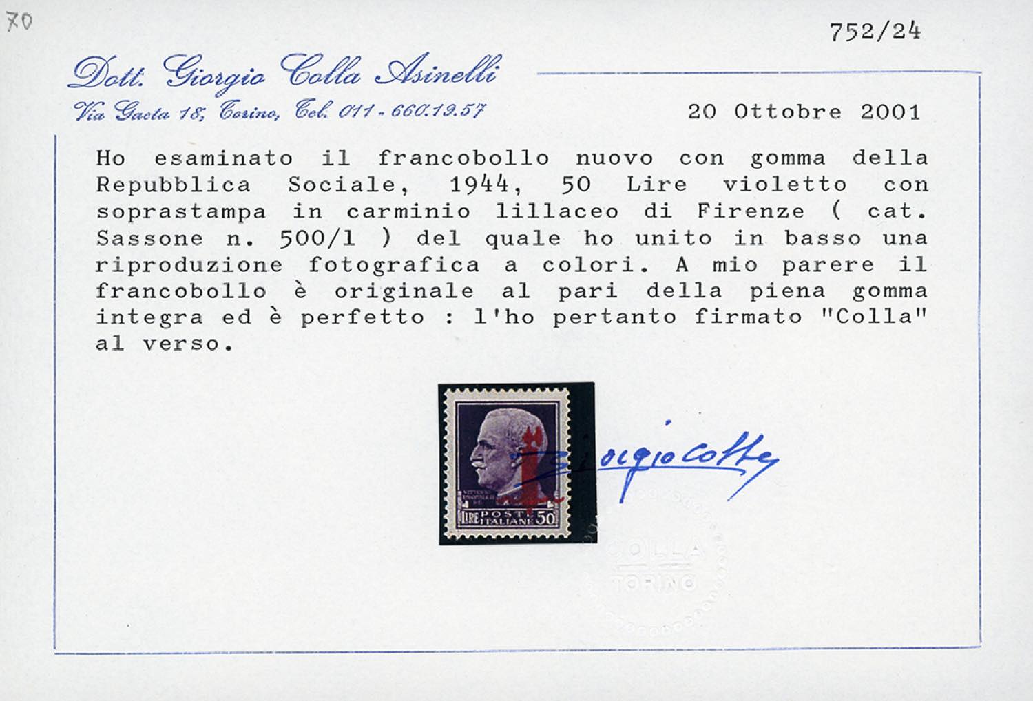 1944 - 50 lire soprastampato fascio in carminio lillaceo, emissione di Firenze (500/I), gomma originale integra, perfetto. Raro, tiratura 450 esemplari. Cert. Colla.