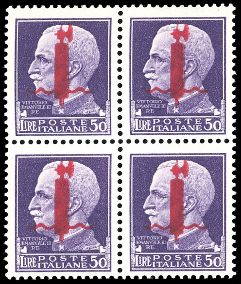 1944 - 50 lire soprastampato fascio, tiratura di Verona (501), blocco di 4, gomma originale integra, perfetto. G.Oliva, cert. E.Diena.