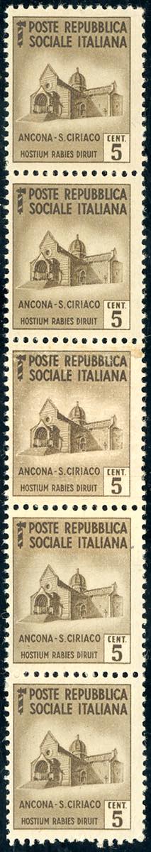 1944 - 5 cent. Monumenti distrutti, senza filigrana, striscia verticale di cinque, due esemplari stampati su carta ricongiunta (502c), gomma originale integra, perfetta. Cert. Ferrario