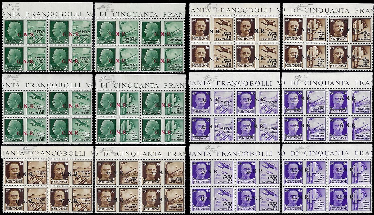 1943 - Serie completa in blocchi di quattro, soprastampa G.N.R. del III tipo di Brescia (13/III-24/III), nuovi, gomma originale integra, ... Leggi tutto