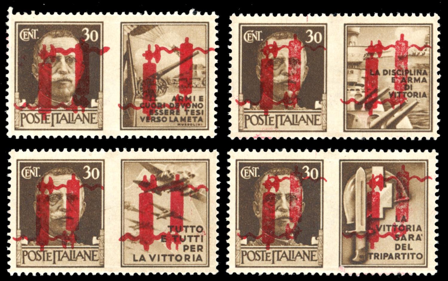 1944 - 30 cent., doppia soprastampa di cui una capovolta, i quattro valori (53b/56b), gomma originale, perfetti. Molto freschi. Ferrraio.