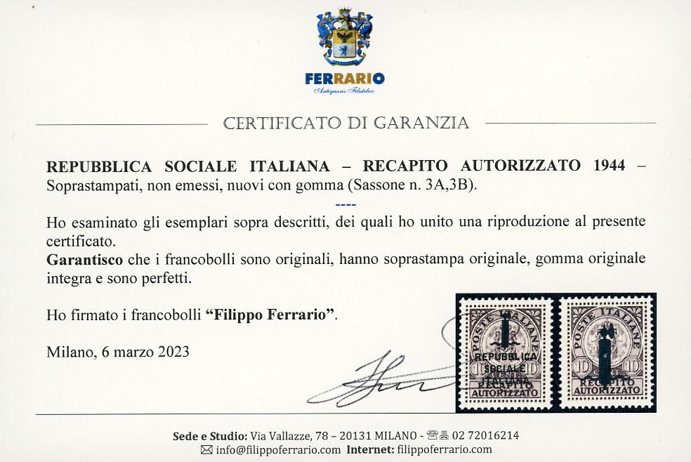 1944 - Non emessi, serie completa (3A/3B), gomma originale integra, perfetti. Per il primo G.Oliva, per il secondo Raybaudi e cert. Bolaffi, cert. Ferrario.