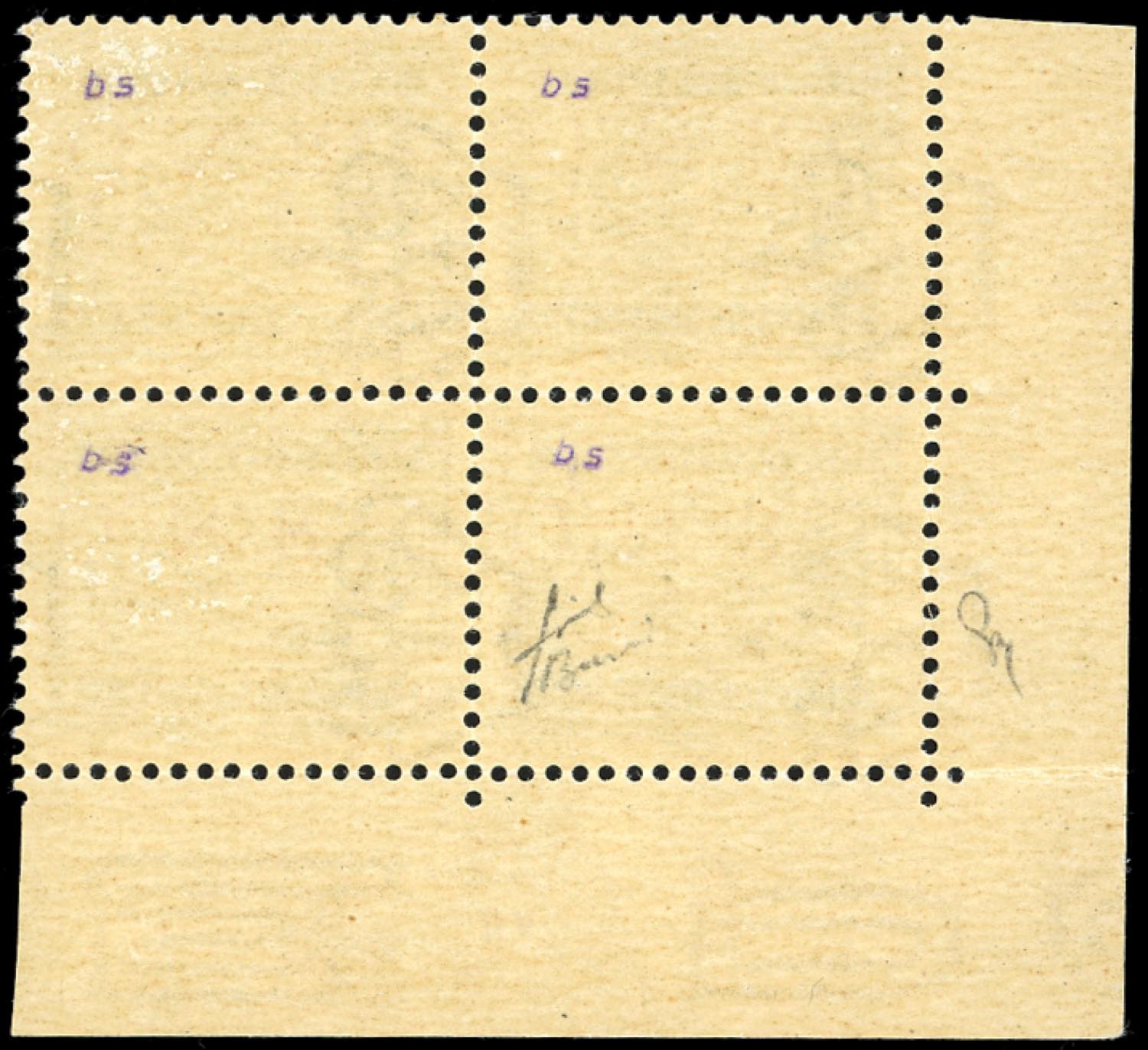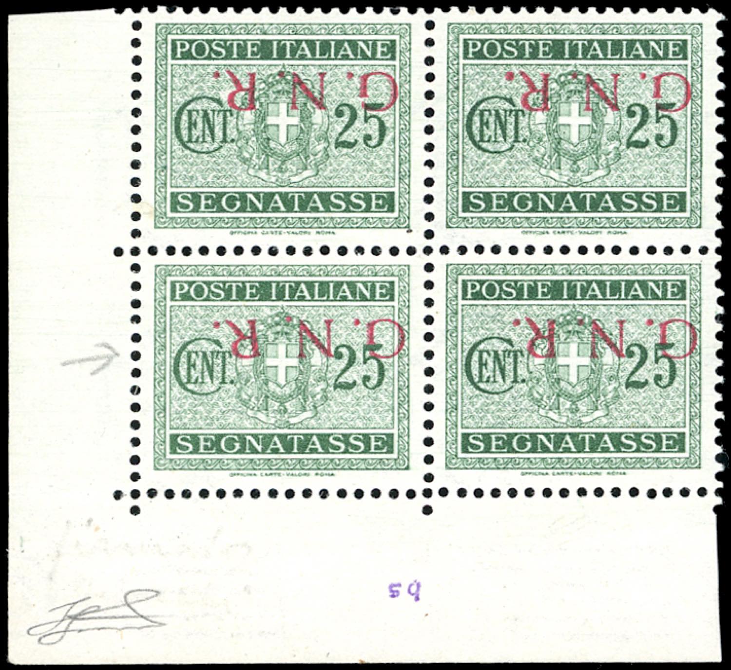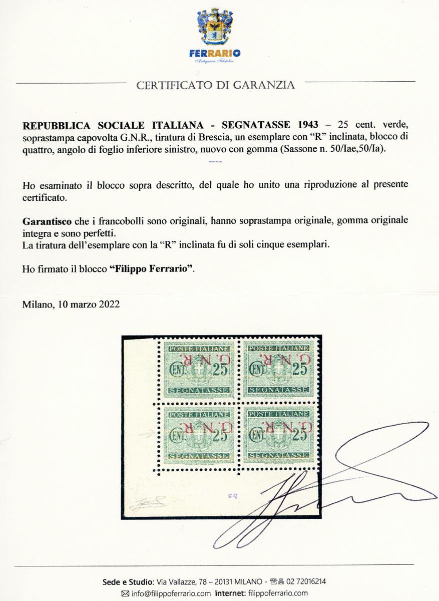 1943 - 25 cent. soprastampa G.N.R. di Brescia capovolta, blocco di quattro, un esemplare con "R" inclinata (50/Iae,50/Ia), angolo di foglio, gomma originale integra, perfetto. Rarissimo, tiratura cinque esemplari. Fiecchi, cert. Ferrario.