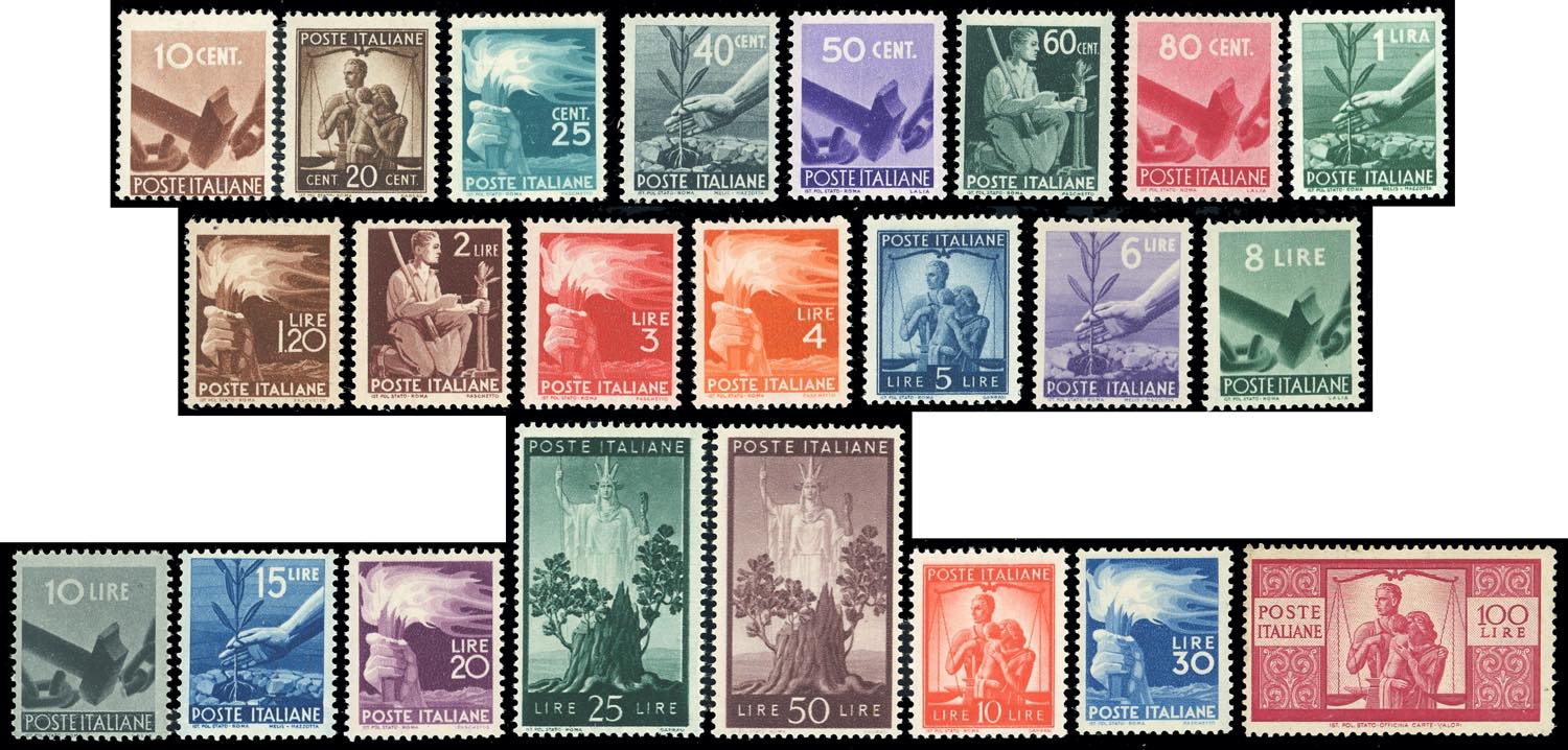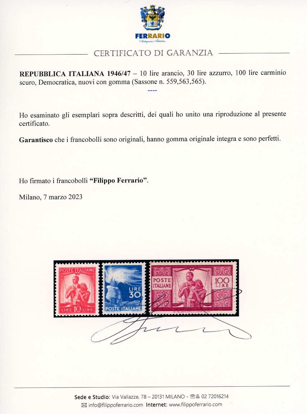 1945/48 - Democratica, serie completa (543/565), gomma originale integra, perfetti. Cert. Ferrario per gli alti valori.
