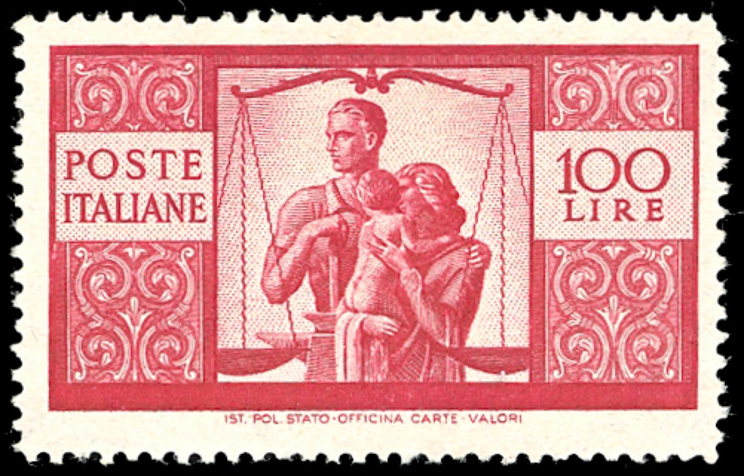 1945 - 100 lire Democratica (565), formato verticale più grande a causa di un salto di dentellatura, ben centrato, gomma originale integra, perfetto. Interessante.