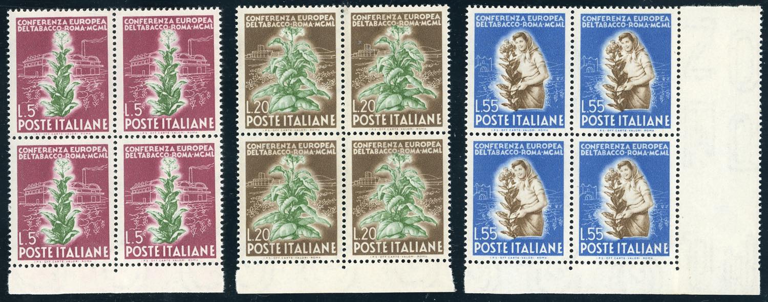 1950 - Tabacco, serie completa (629/631), ottima centratura, blocchi di quattro, bordo/angolo di foglio, gomma originale integra, perfetti. ... Leggi tutto