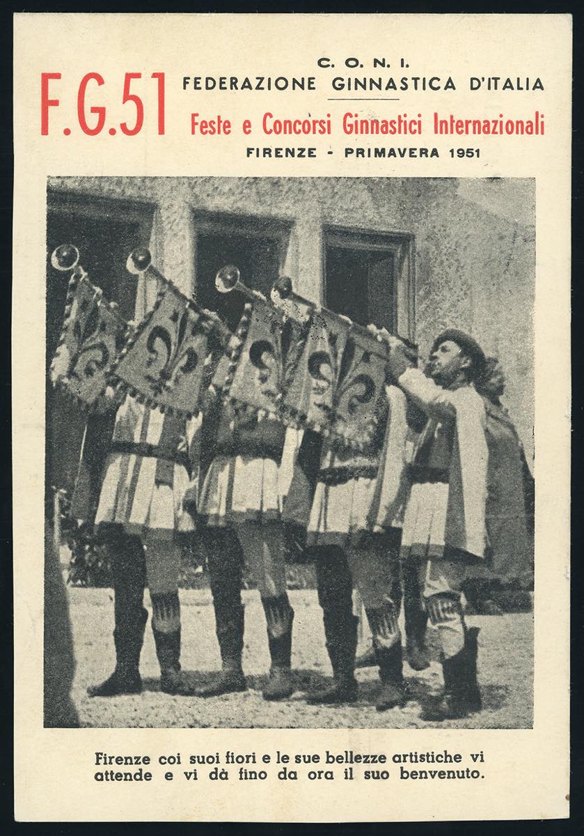 1951 - Ginnici, serie completa (661/663), perfetti, su cartolina ufficiale della manifestazione da Firenze 22/5/1951, bollo speciale, per città. A.Diena, Raybaudi.