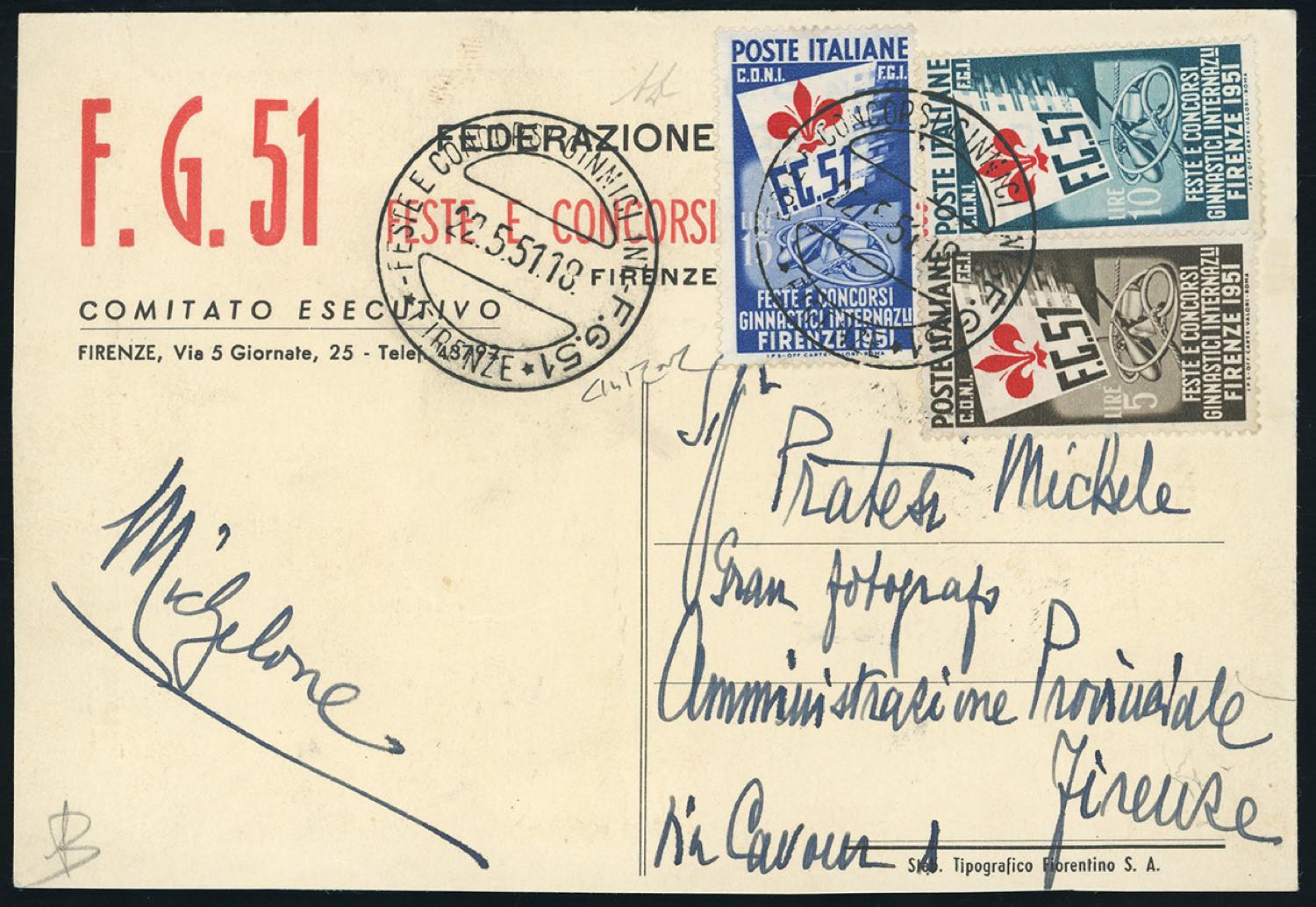 1951 - Ginnici, serie completa (661/663), perfetti, su cartolina ufficiale della manifestazione da Firenze 22/5/1951, bollo speciale, per ... Leggi tutto