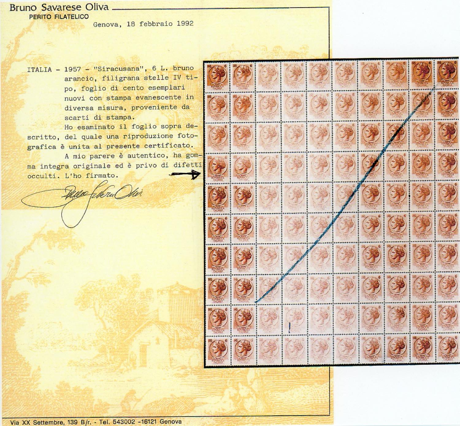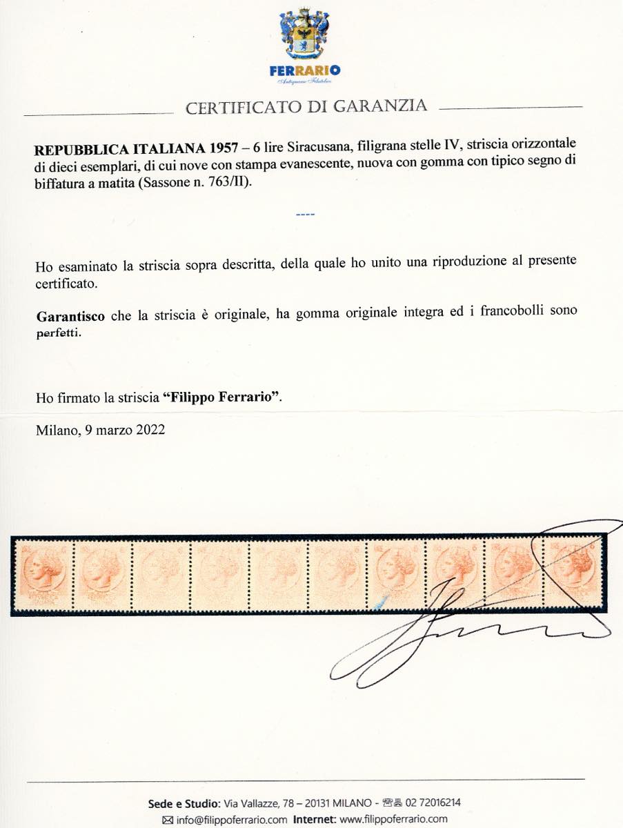 1957 - 6 lire Siracusana, filigrana stelle IV, striscia orizzontale di 10 esemplari, di cui 9 con stampa evanescente (763/II), gomma originale integra, perfetta, con tipico segno di biffatura a matita. Rara varietà, finora non catalogata. Fotocopia cert. Oliva del blocco di provenienza, cert. Ferrario.