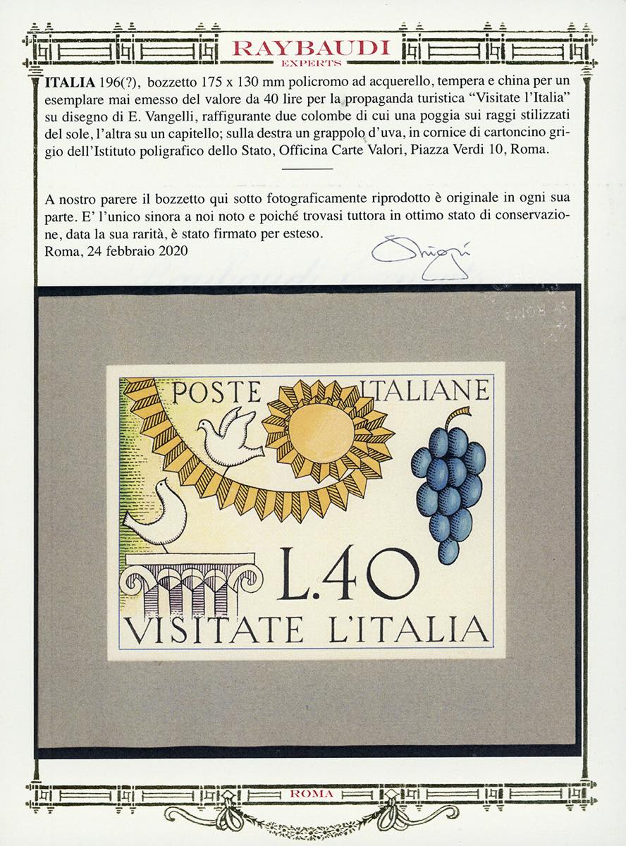 1960/70 ca - Bozzetto policromo ad acquarello, tempera e china per un esemplare mai emesso da 40 lire Visitate l'Italia di E.Vangelli, cm. 17,5x13, montato con passè partout dell' IPZS. UNICO ESEMPLARE NOTO, splendido. Cert. Oro Raybaudi.