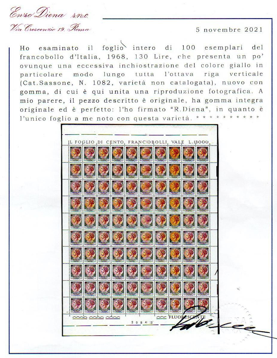 1968 - 130 lire Siracusana (1082), foglio completo di cento esemplari con eccessiva inchiostrazione del colore giallo su quasi tutti gli esemplari, in particolare su quelli dell'ottava colonna, gomma originale integra, perfetto. Molto raro, ad oggi si tratta dell'unico foglio noto con questa varietà. Cert. Diena.