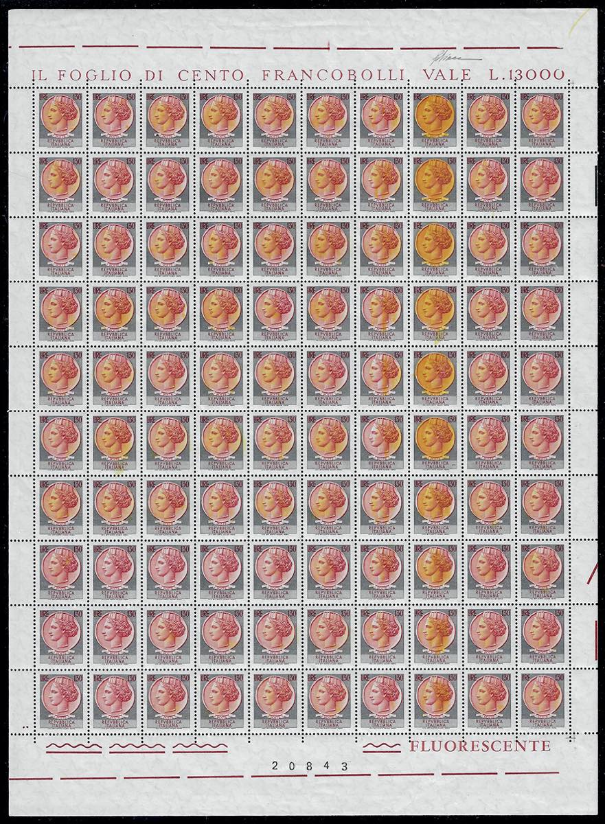1968 - 130 lire Siracusana (1082), foglio completo di cento esemplari con eccessiva inchiostrazione del colore giallo su quasi tutti gli ... Leggi tutto