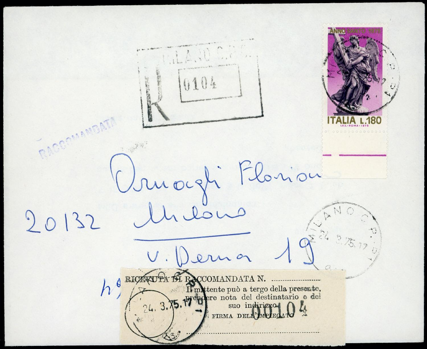 1975 - 180 lire Anno Santo (1288), bordo di foglio, perfetto, isolato su busta raccomandata da Milano 24/3/1975, primo giorno d'emissione, per città. Raro uso isolato, possibile solo per questo giorno.