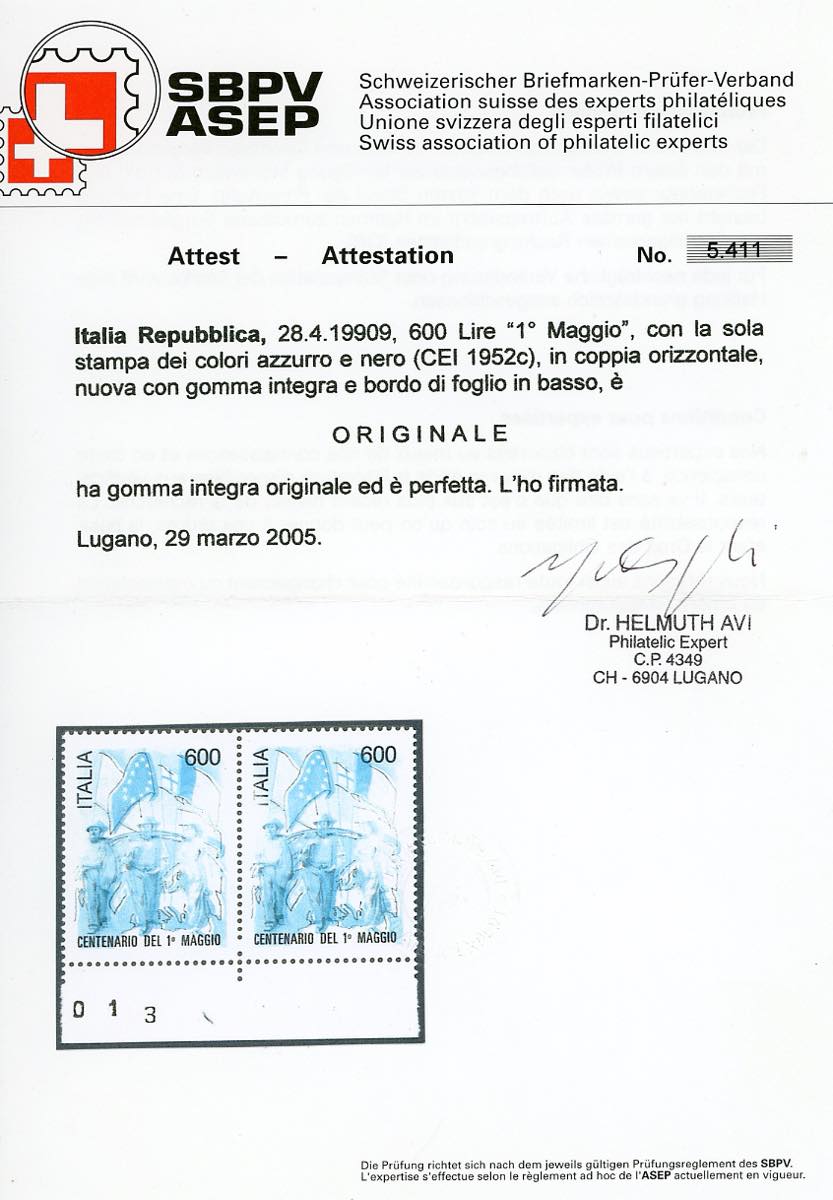 1990 - 600 lire I maggio (1933), con la sola stampa dell'azzurro e del nero, bordo di foglio, gomma integra, perfetto. Raro! Cert. Raybaudi ... Leggi tutto