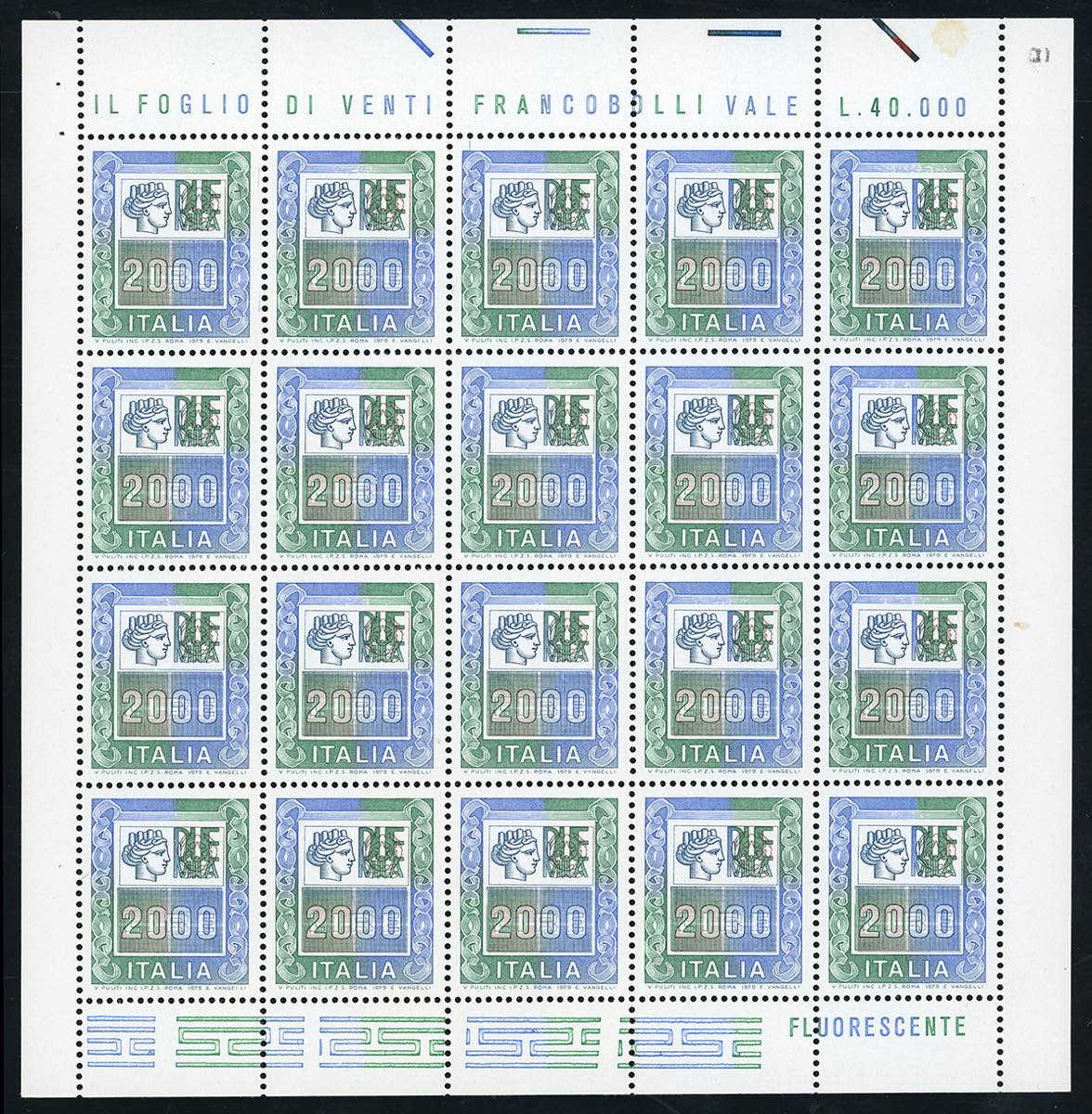 1978 - 2.000 lire Alti valori, minifoglio di 20 esemplari (1439), gomma originale integra, perfetto.
