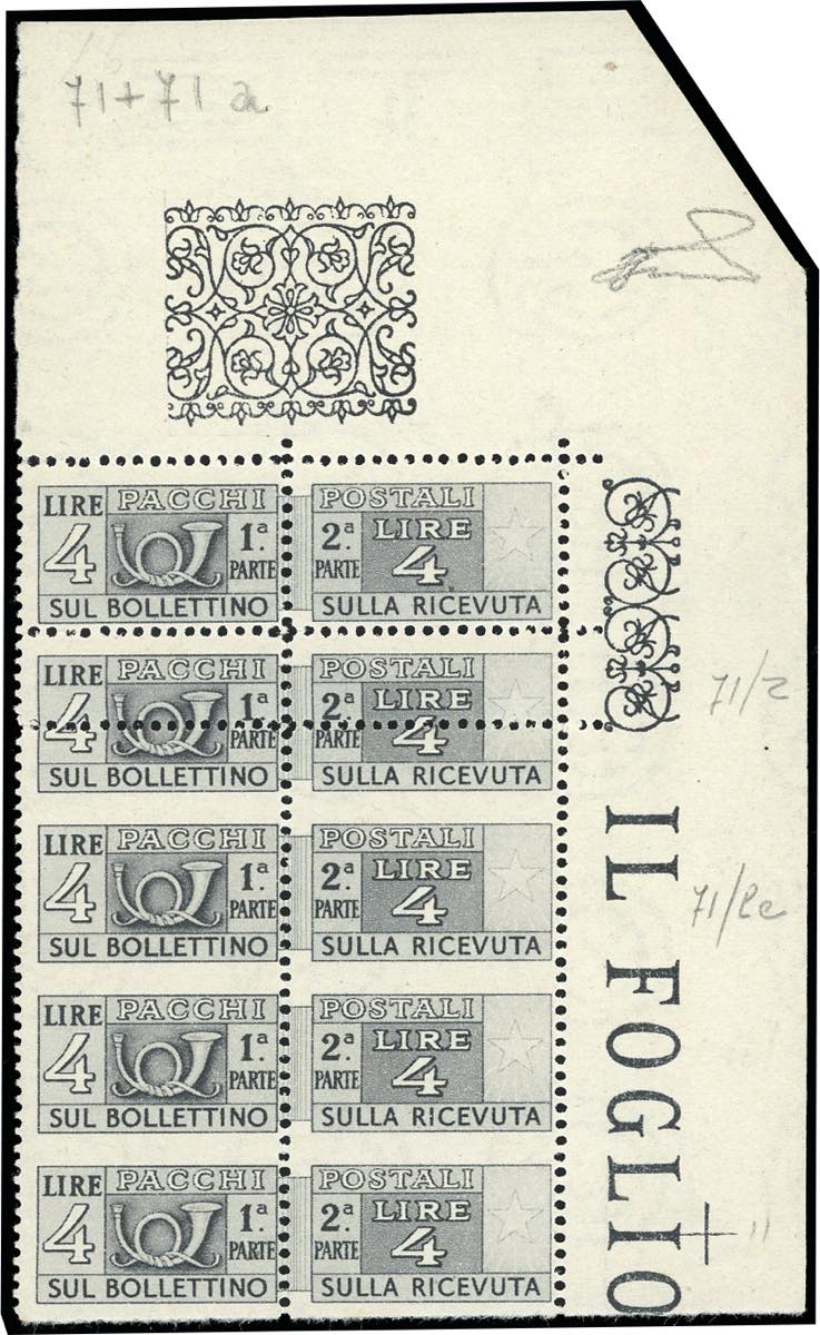 1946 - 4 lire, filigrana ruota (71), striscia verticale di 5, il secondo esemplare con dentellatura inferiore spostata al centro, gli ultimi 3 non dentellati orizzontalmente, angolo di foglio, gomma originale integra, perfetto. Ferrario.
