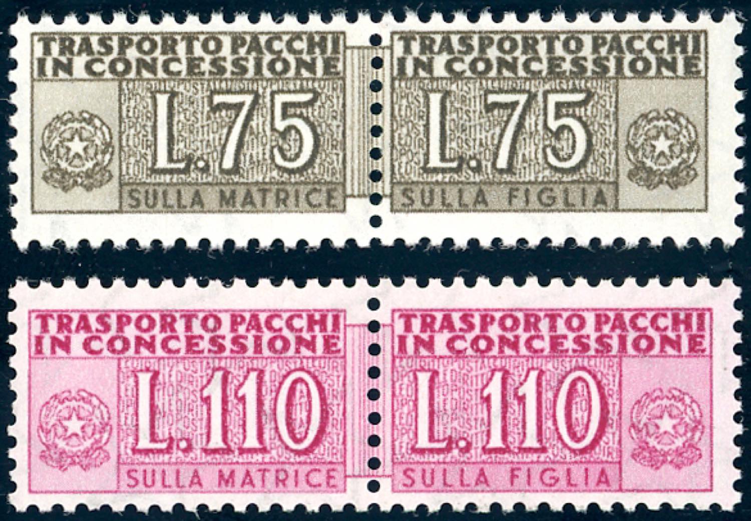1955 - 75 lire e 110 lire, filigrana stelle (9,12), gomma originale integra, perfetti. Cert. Ferrario.