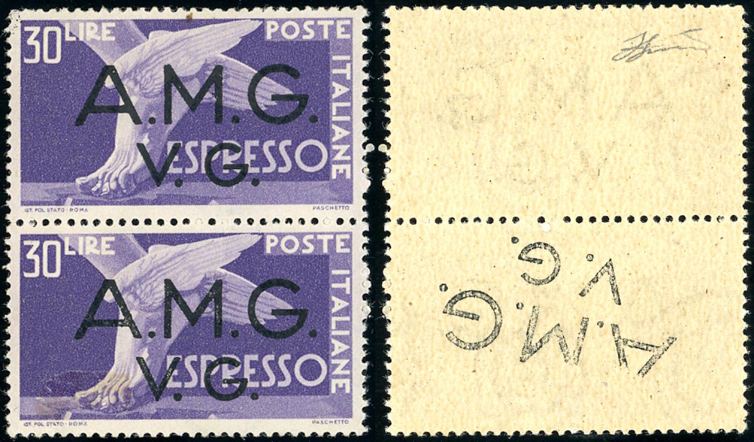ESPRESSI 1946 - 30 lire, soprastampa recto-verso (2aa), in coppia con il normale, gomma integra, perfetta. RARISSIMA, PROBABILMENTE UNICA. ... Leggi tutto