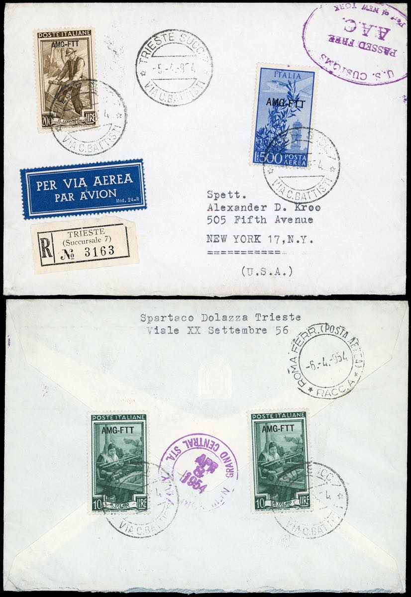1954 - 200 lire, 10 lire (due esemplari al verso) Lavoro, 500 lire Campidoglio (107,94,A25), perfetti, su aerogramma raccomandato da Trieste 5/4/1954 a New York, Stati Uniti, bollo d'arrivo. Non comune.