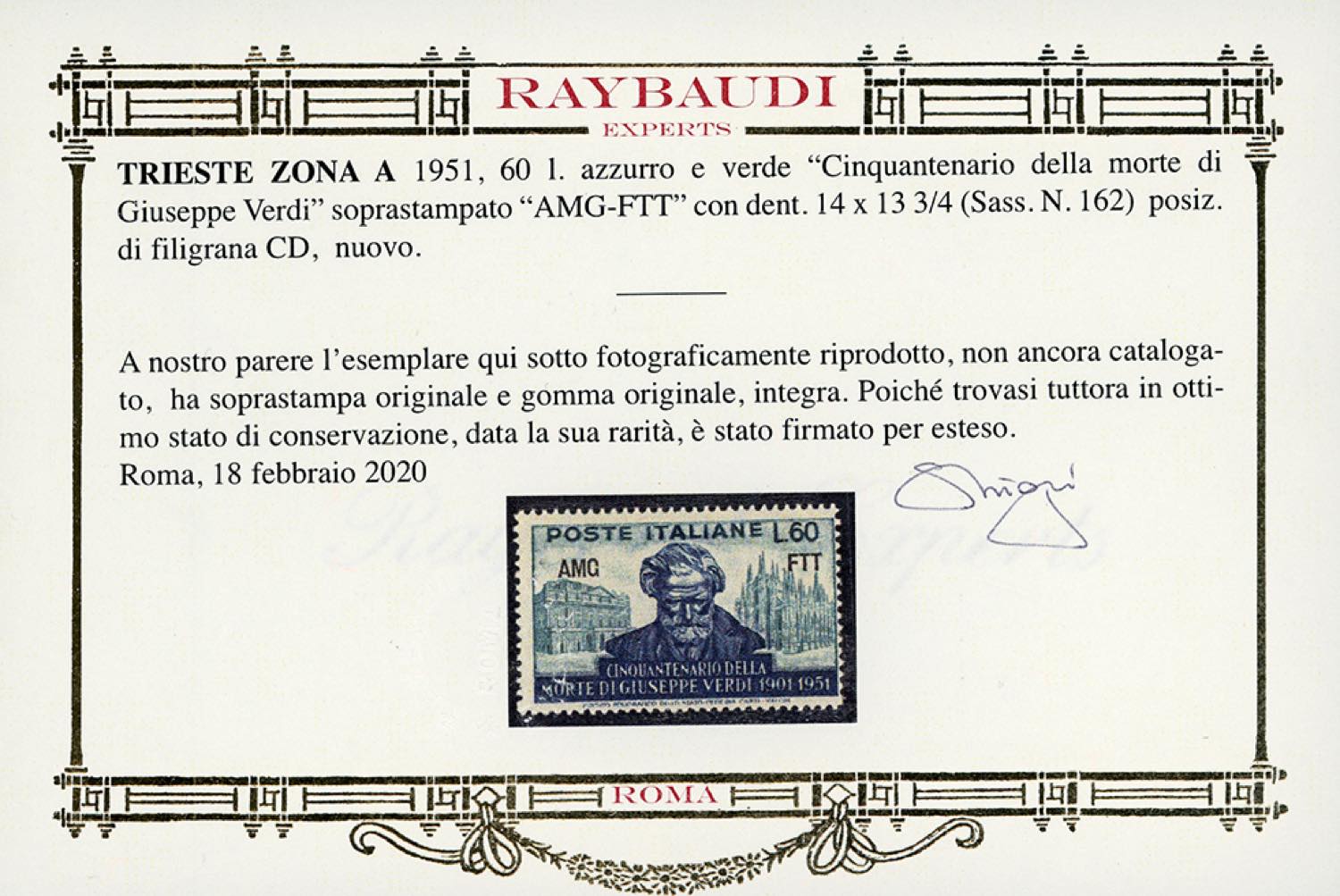 1951 - 60 lire Verdi (137), dent. 14 x 13 3/4, filigrana posizione CD, gomma originale integra, perfetto. UNICO ESEMPLARE NOTO, non catalogato. Rarità del settore. Cert. Oro Raybaudi.