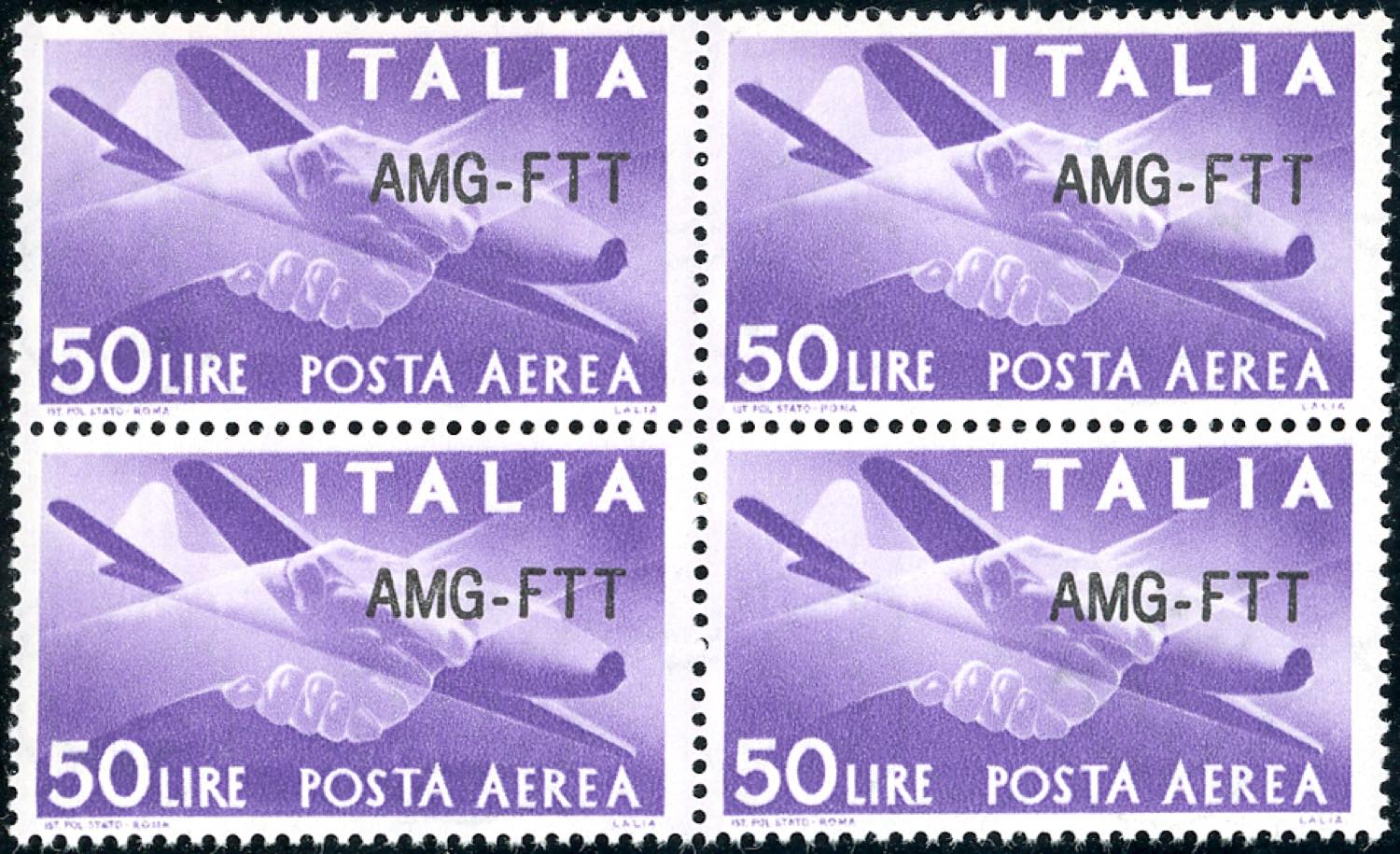 POSTA AEREA 1954 - 50 lire, nuovo tipo di soprastampa (22A), ottima centratura, blocco di quattro, gomma integra, perfetto. Cert. Ferrario.