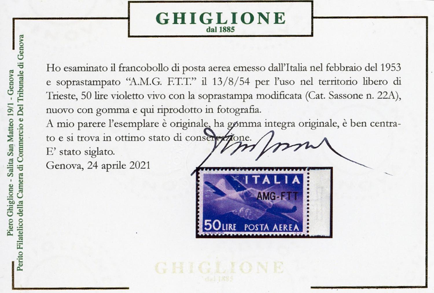 POSTA AEREA 1954 - 50 lire, nuovo tipo di soprastampa (22A), ottima centratura, bordo di foglio, gomma originale integra, perfetto. Bello. Ferrario, Cert. Ghiglione.