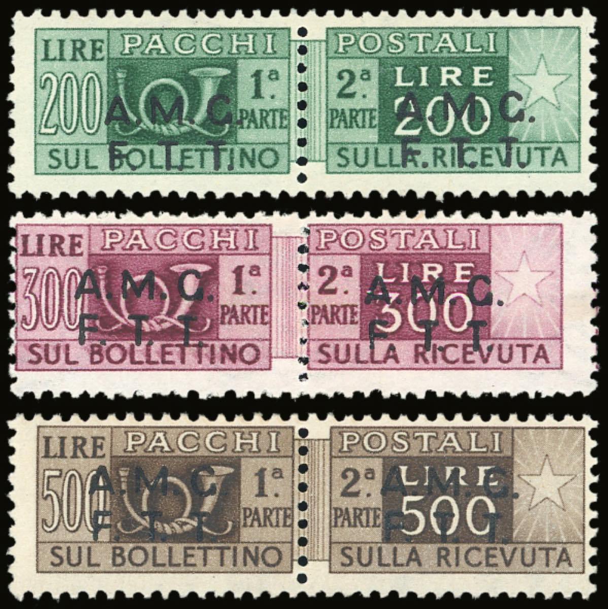 PACCHI POSTALI 1947 - 200 lire, 300 lire e 500 lire soprastampati su due righe (10/12), gomma originale integra, perfetti. Cert. Ferrario.