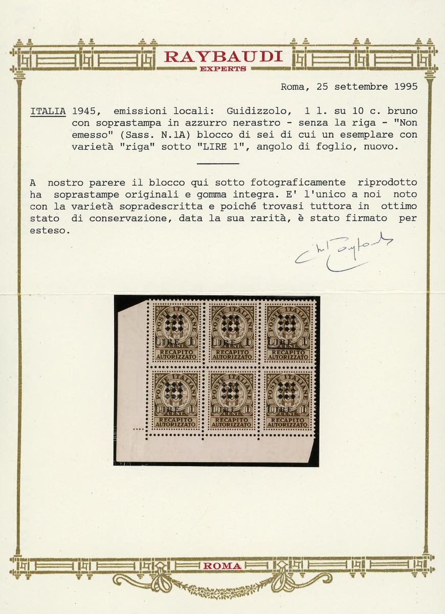 GIUDIZZOLO 1945 - 1 lira su 10 cent., coppia verticale con l'esemplare superiore con una riga di colore sotto la dicitura del valore, corrispondente al n. 1 (1Aa), gomma originale integra, perfetta. UNICA NOTA! Cert. Oro Raybaudi del blocco di provenienza.