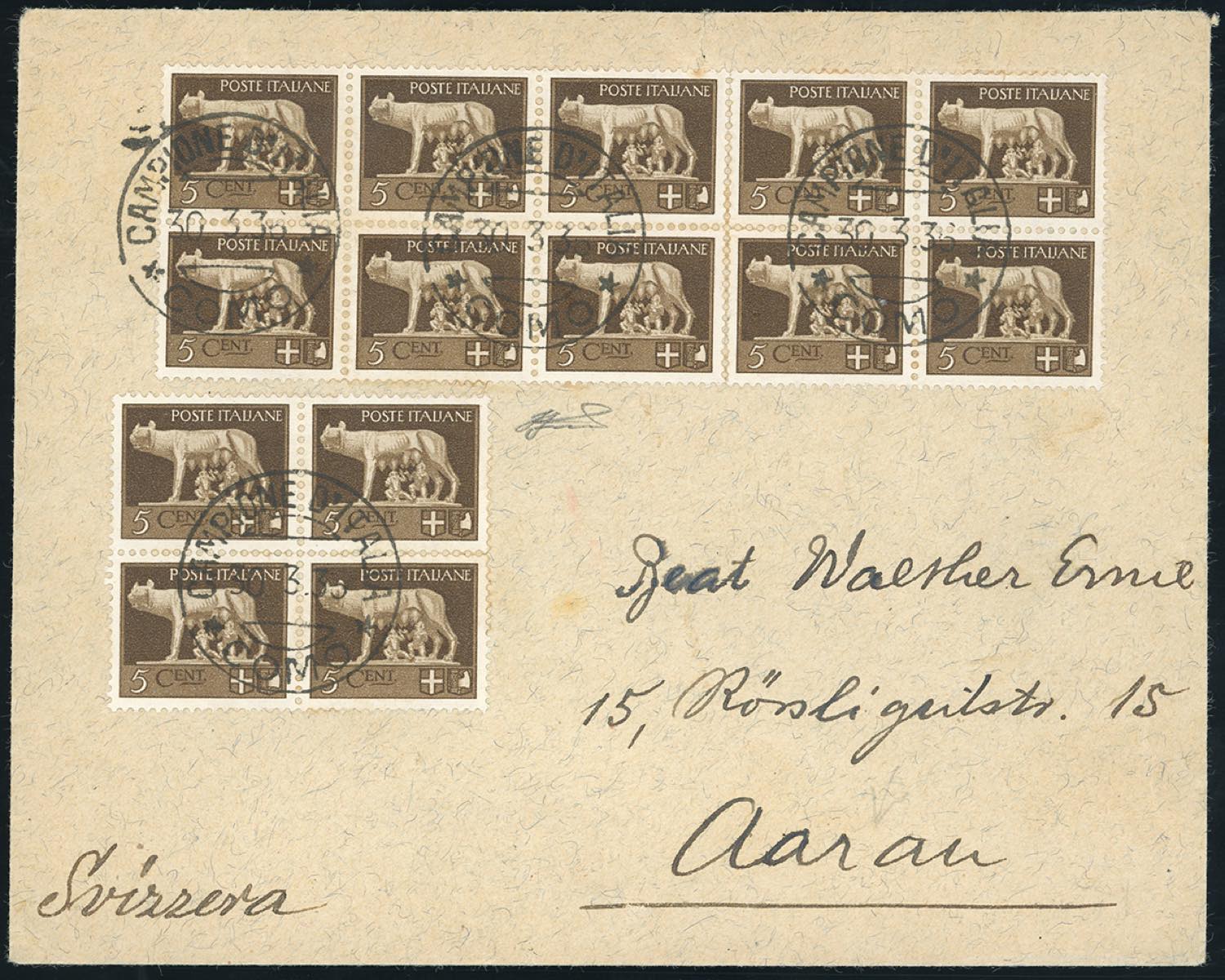 CAMPIONE D'ITALIA 1935 - 5 cent. Imperiale (243), 14 esemplari, perfetti, su busta da Campione 30/3/1935 per la Svizzera. Non comune. Ferrario.