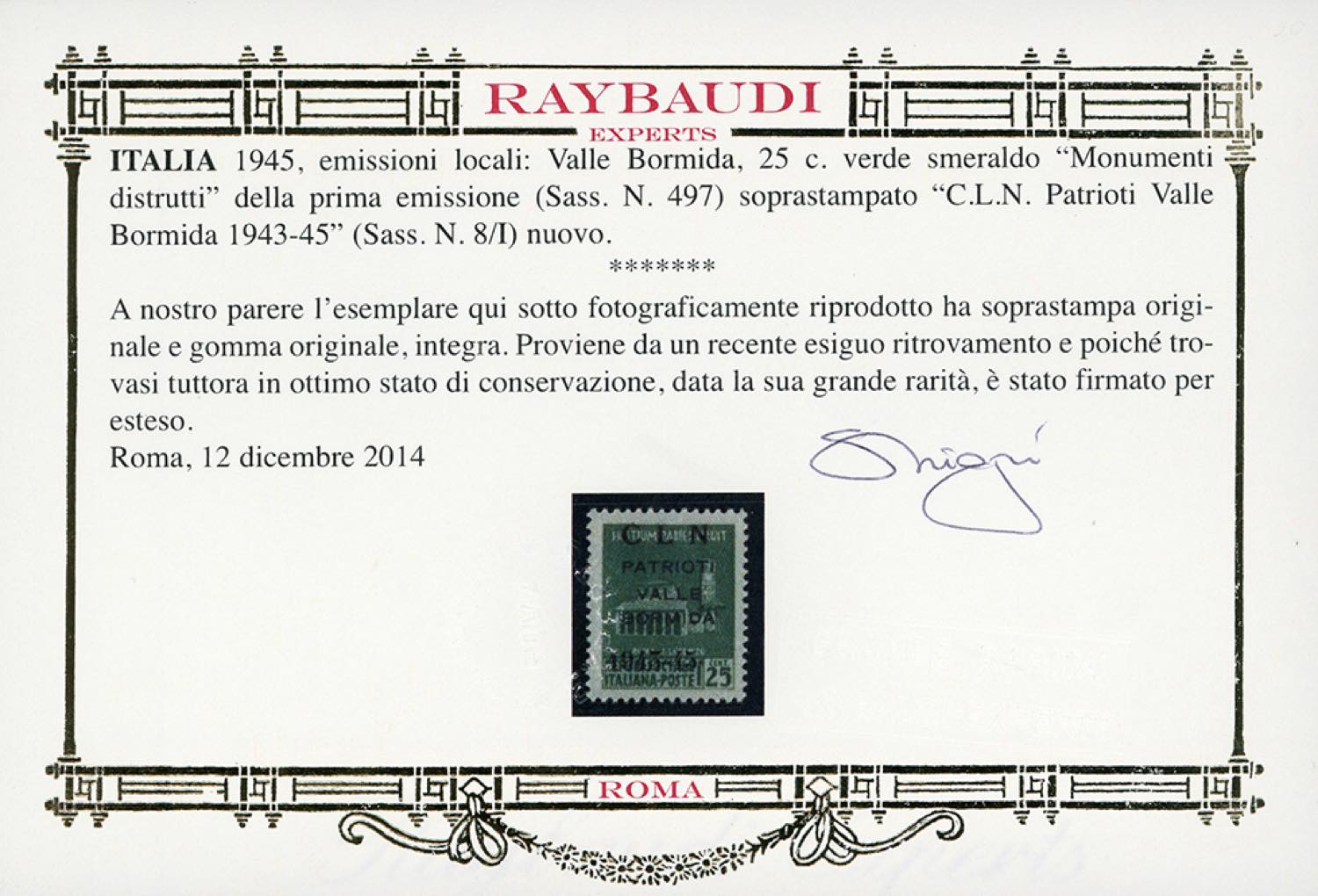 VALLE BORMIDA 1945 - 25 cent. Monumenti distrutti, I emissione, soprastampato (8/I), gomma originale integra, perfetto. Molto raro. Cert. ... Leggi tutto