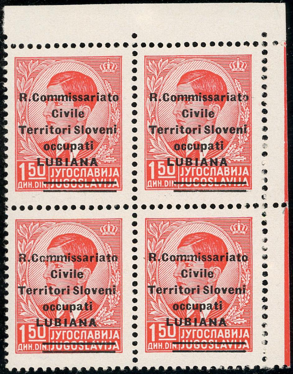LUBIANA 1941 - 1,50 d. soprastampa modificata (34), blocco di quattro, singolo di foglio, gomma integra, perfetto. Bello. A.Diena, Ferrario, cert. Julij Bar.