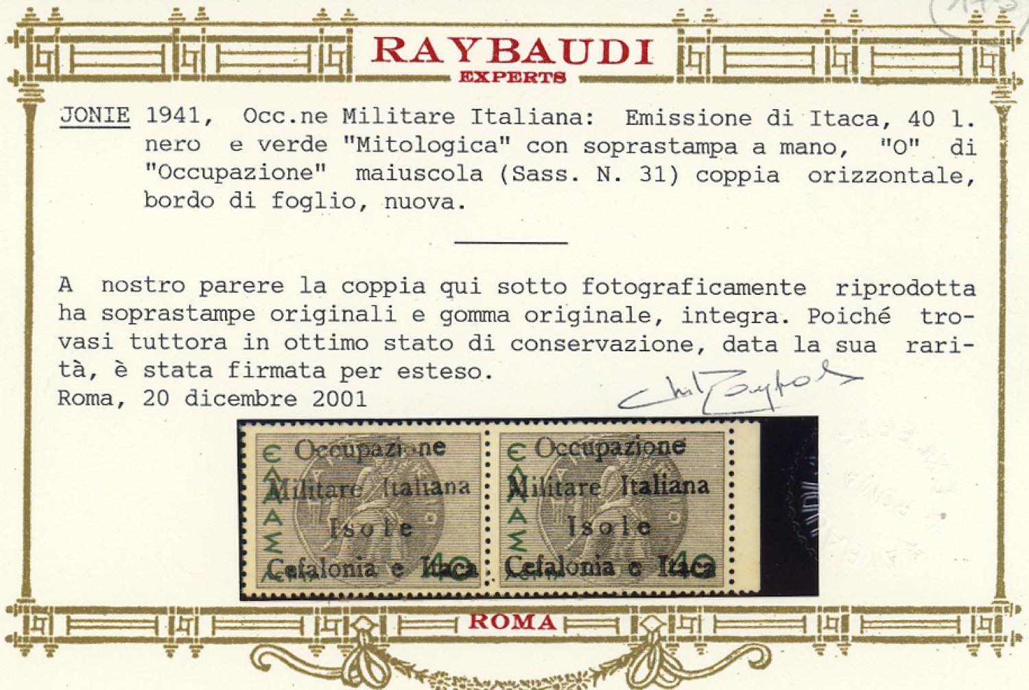 CEFALONIA E ITACA 1941 - 40 lepta Mitologica, soprastampa a mano, "o", di "Occupazione" maiuscola, emissione di Itaca (31), bordo di foglio, gomma originale integra, perfetto. Cert. Oro Raybaudi della coppia di provenienza.