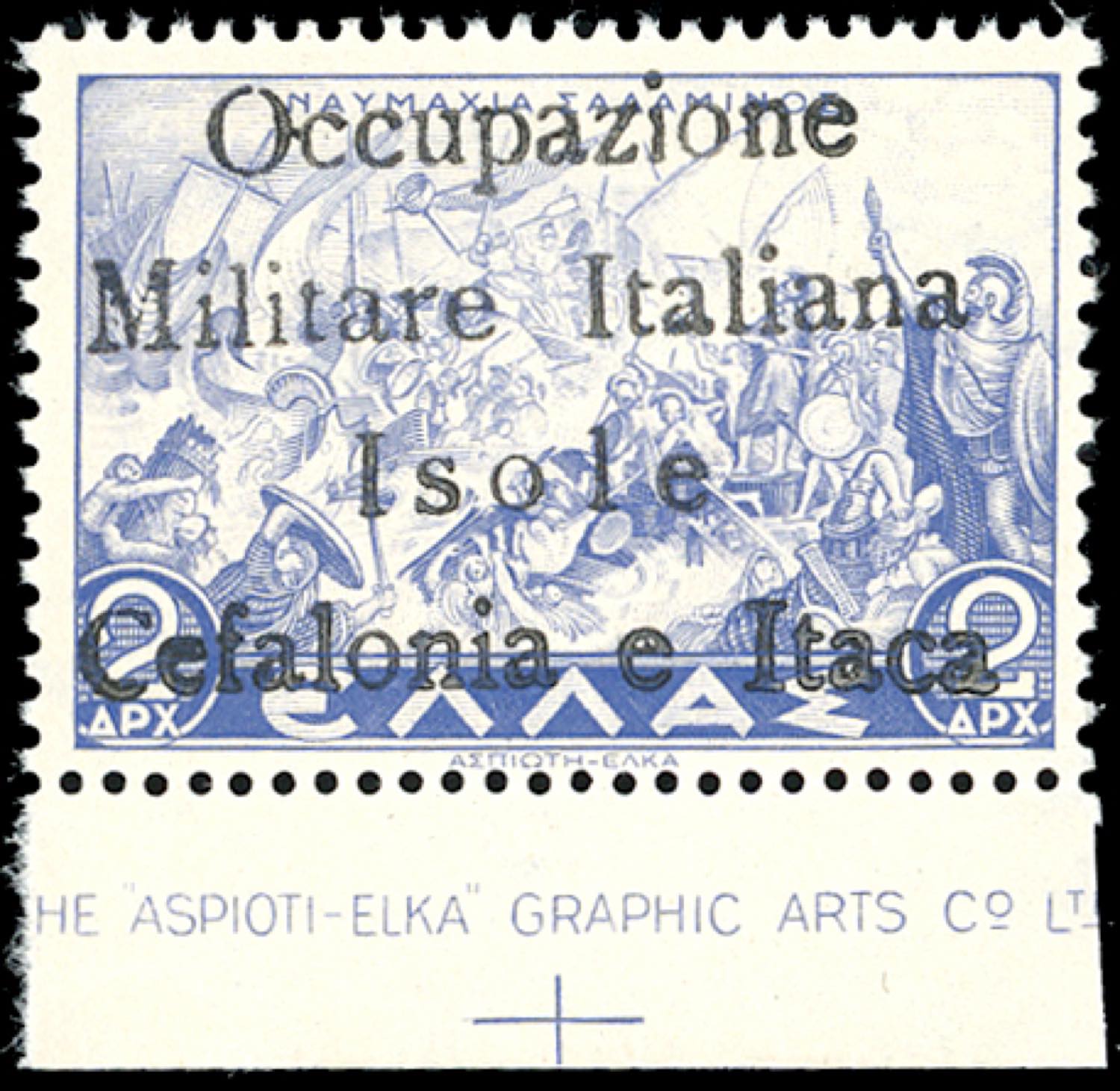 CEFALONIA E ITACA 1941 - 2 dracme Mitologica, soprastampa a mano, "o" di "Occupazione" maiuscola, emissione di Itaca (34), bordo di foglio, ... Leggi tutto