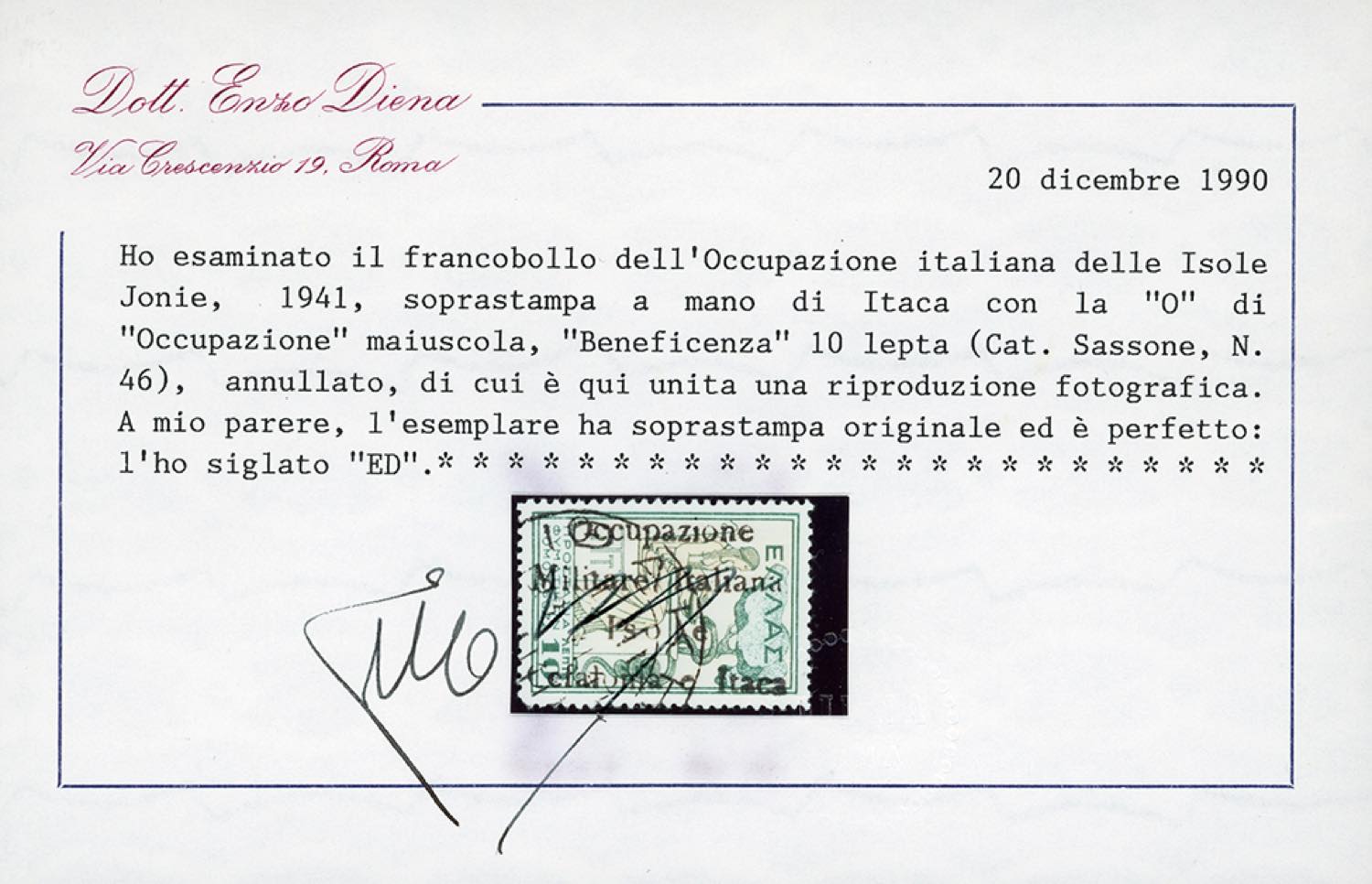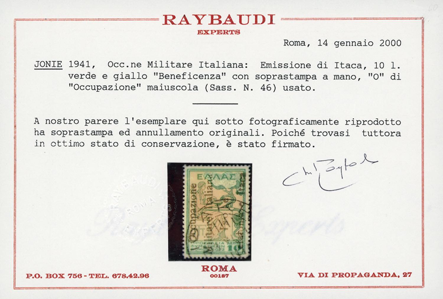 EMISSIONI DI ITACA 1941 - 10 l. Beneficenza (46), usato, perfetto. Raro. Modolfo, A.Diena, Ferrario, cert. Raybaudi ed E.Diena.