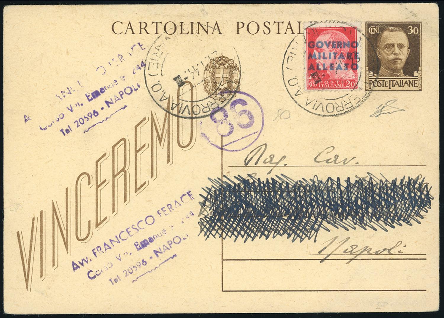 AMGOT OCCUPAZIONE ANGLO-AMERICANA NAPOLI 1944 - 20 cent. soprastampato, I tiratura (10A), perfetto, in affrancatura mista su cartolina ... Leggi tutto