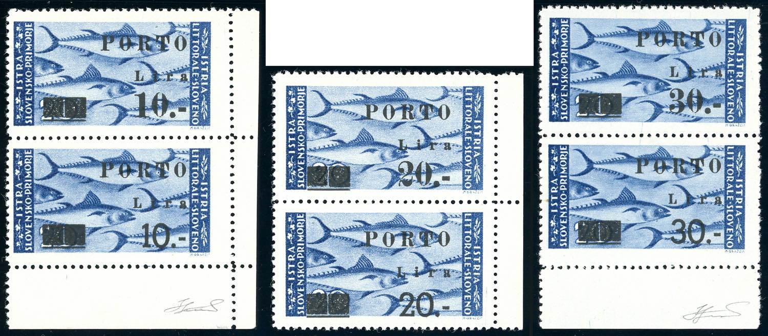 OCCUPAZIONE JUGOSLAVA ISTRIA-LITORALE SLOVENO SEGNATASSE 1946 - 10 lire su 20 lire, 20 su 20 lire, 30 su 20 lire Cifre Sottili, tutti in coppia con l'esemplare normale (17B+17,18B+18, 19B+19), bordo di foglio, gomma integra, perfette. Molto rare. Cert. Cilio e Ferrario.