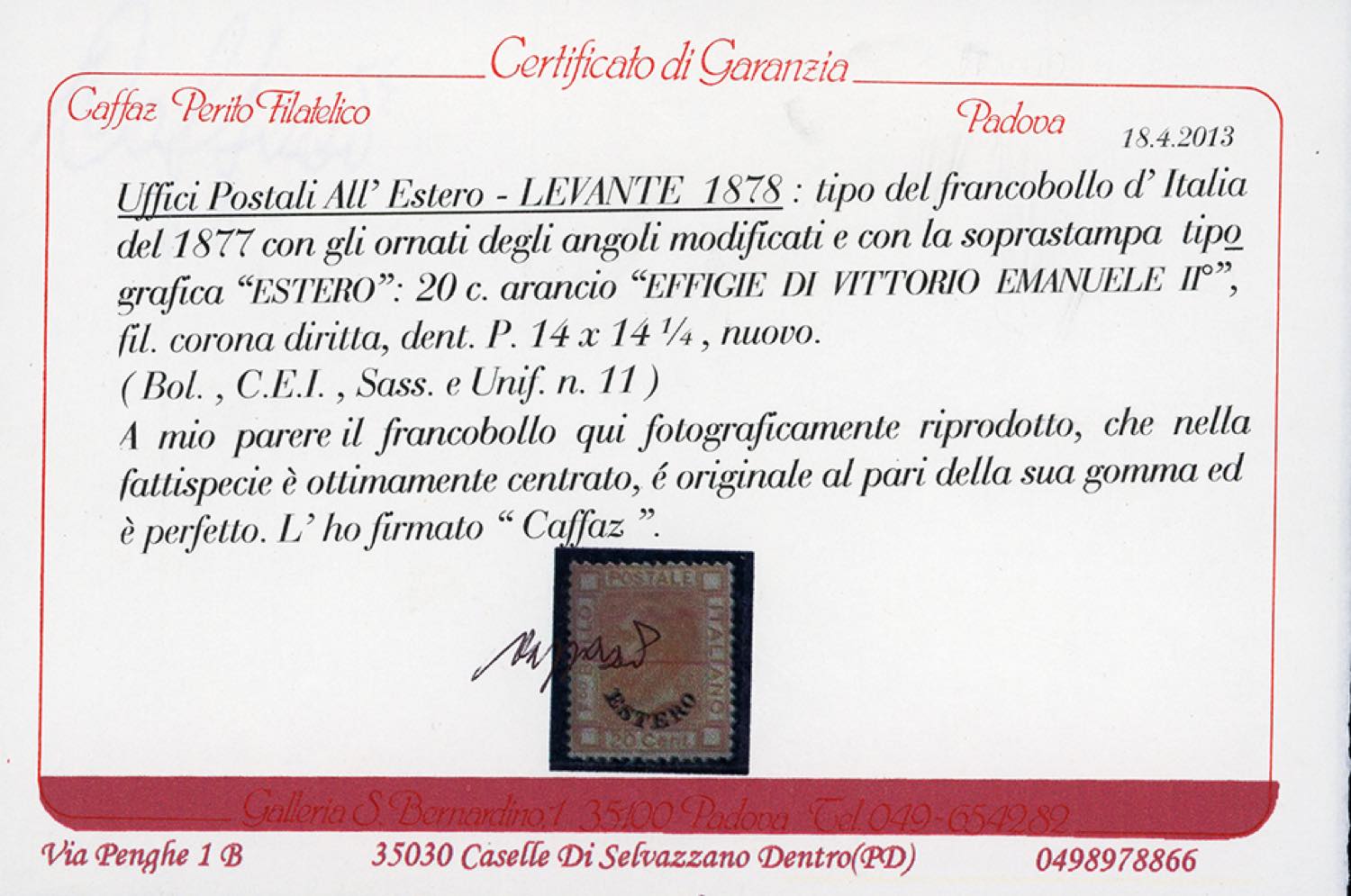 EMISSIONI GENERALI 1878 - 20 cent. arancio (11), buona ottima/centratura, gomma originale, perfetto. Bello e raro! Cert. Caffaz.