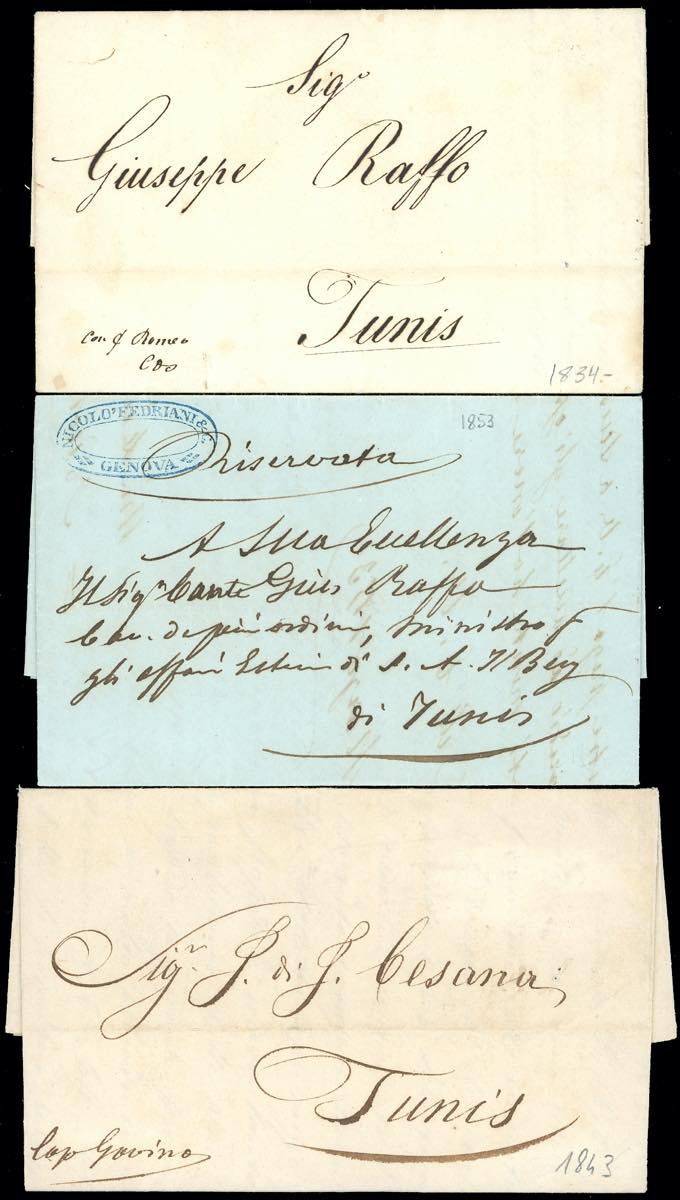TUNISI 1834/53 - Cinque lettere del periodo da Genova a Tunisi, senza segni di posta, quattro delle quali recano sul fronte l'indicazione ... Leggi tutto