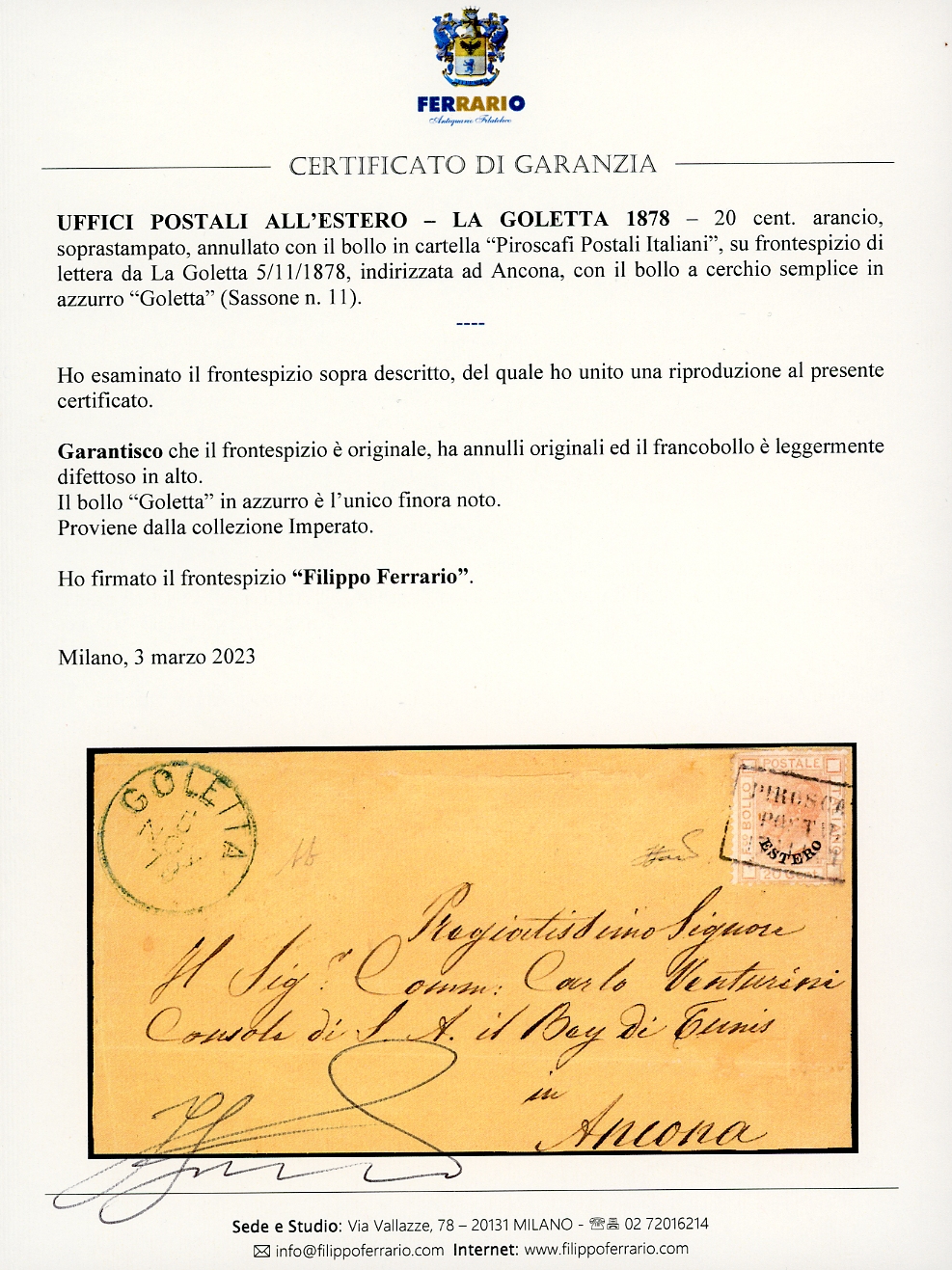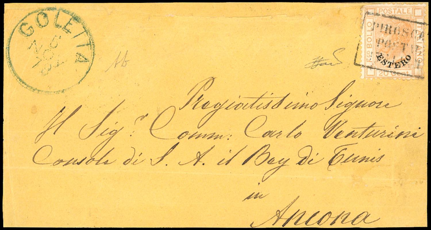 LA GOLETTA, GOLETTA cerchio semplice azzurro non catalogato - 20 cent. arancio soprastampato (11), su frontespizio di lettera da La Goletta 5/11/1878 ad Ancona, francobollo annullato con il bollo in cartella Piroscafi Postali Italiani. Le pochissime impronte note del bollo a cerchio semplice Goletta sono tutte in nero. INSIEME UNICO, per specialista. A.Diena, cert. Ferrario. Ex coll. Imperato.