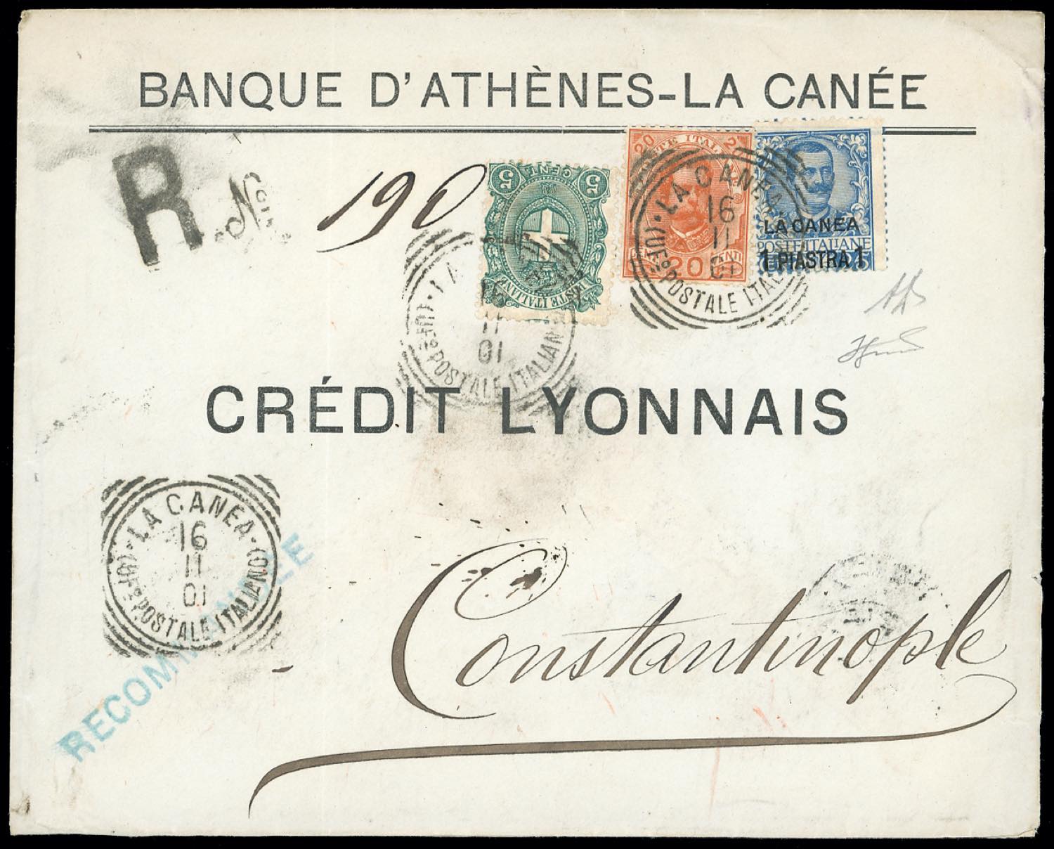 LA CANEA 1901 - 1 pi. su 25 cent. (2), in affrancatura mista con 5 cent. e 20 cent. Umberto I di Regno (67,61), perfetti, su busta raccomandata da La Canea 16/11/1901 a Costantinopoli. Interessante e rara tricolore. A.Diena, Ferrario.