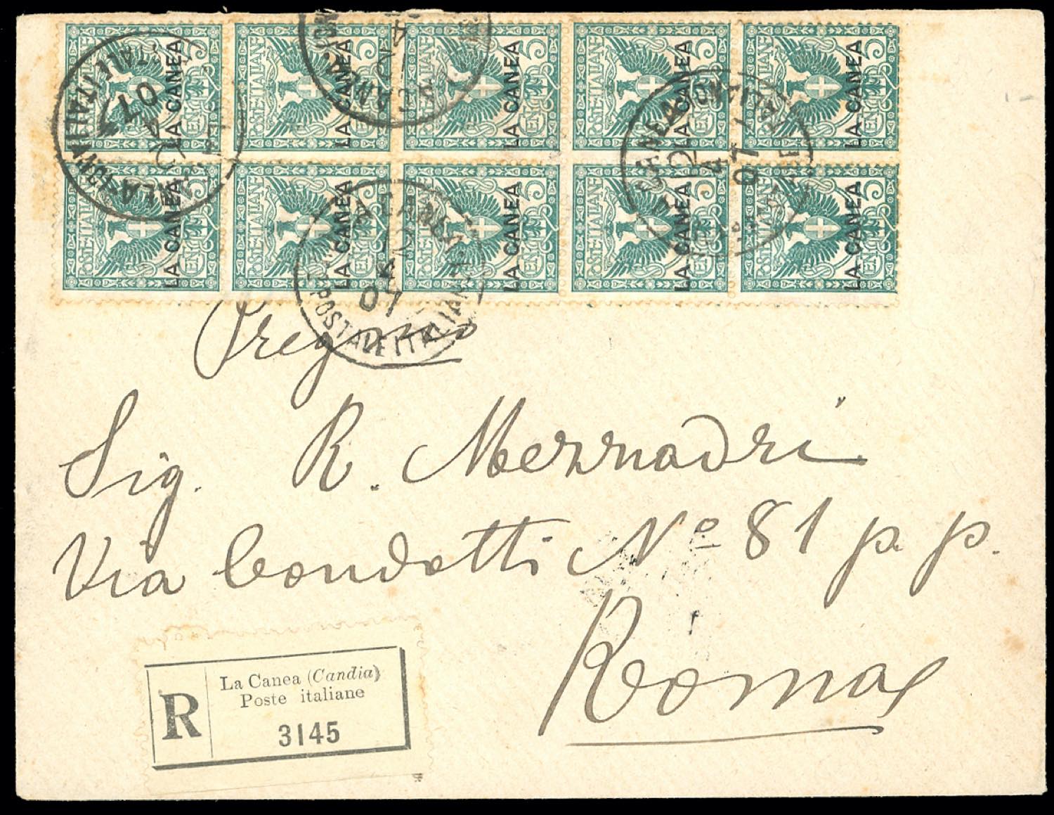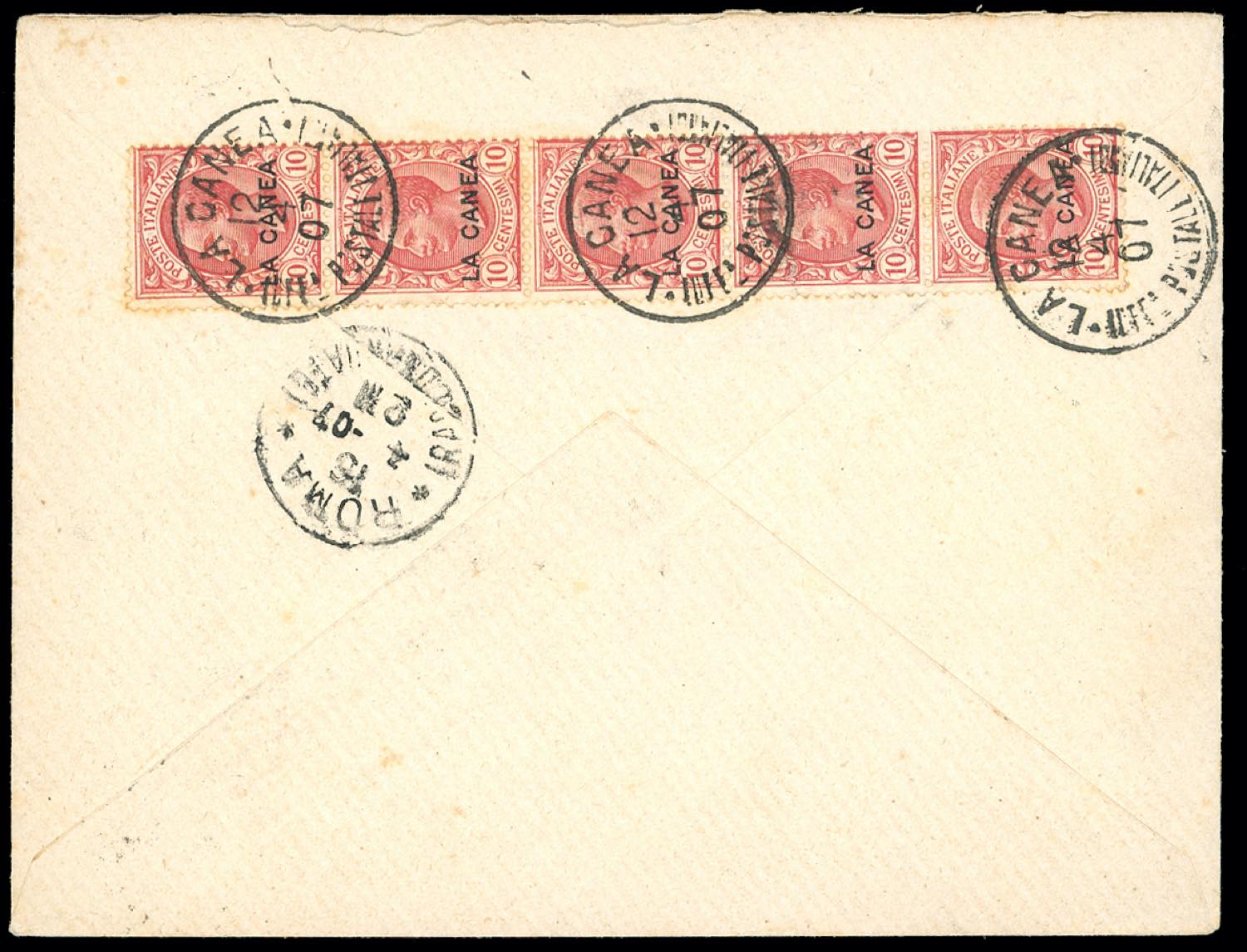 LA CANEA 1907 - 5 cent. Floreale, blocco di 10 esemplari e 10 cent. Leoni, striscia di 5 esemplari, apposta al verso (5,15), su raccomandata da La Canea 12/4/1907 a Roma, bollo d'arrivo. Molto rara! Ferrario.