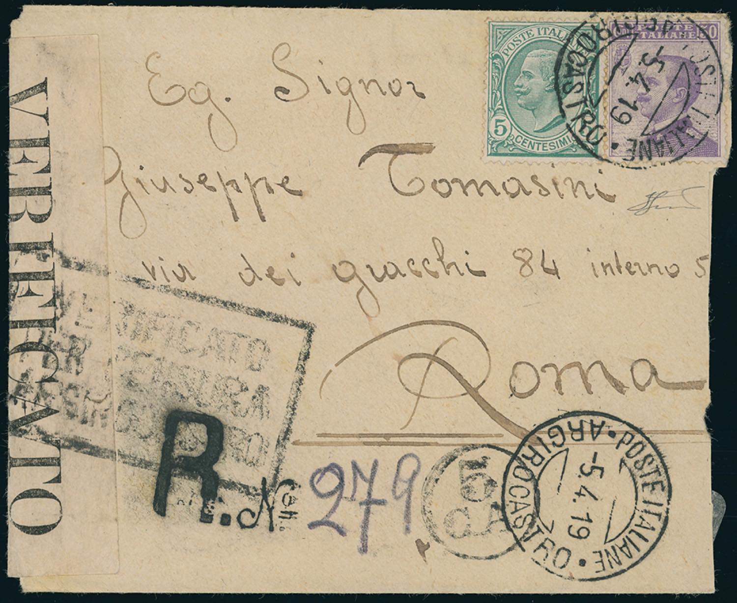 ALBANIA-ARGIROCASTRO 1919 - 5 cent. Leoni, Michetti (Regno 81,85), pefetti, su busta raccomandata da Argicastro 5/4/1919 a Roma, verificata per censura. Rara! Ferrario.